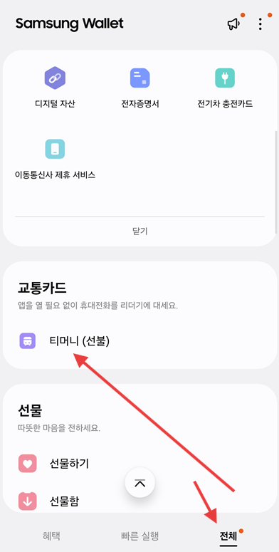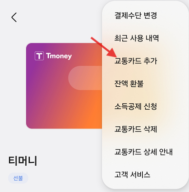 🟦 2단계: 하단 메뉴에서 ‘교통카드’ 선택