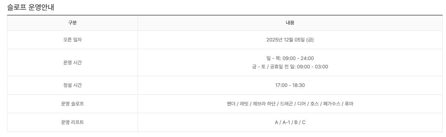 스키장 슬로프는 기온, 적설량, 제설 상태, 안전 점검에 따라 운영 여부가 수시로 달라집니다.